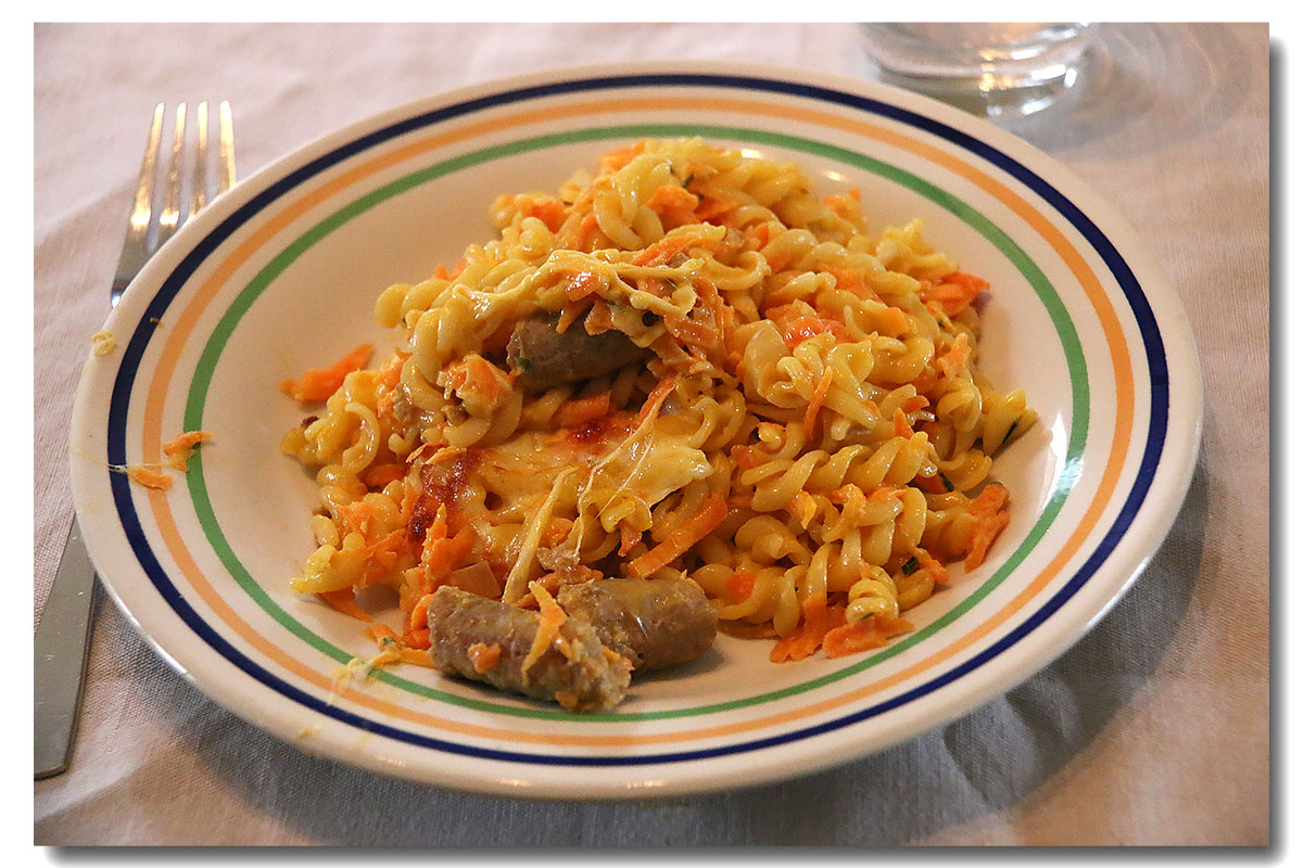Mélangez les pâtes avec les carottes râpées et les chipolatas. Transvasez-les dans un plat à four et parsemez de mozzarella râpée.