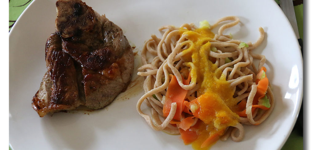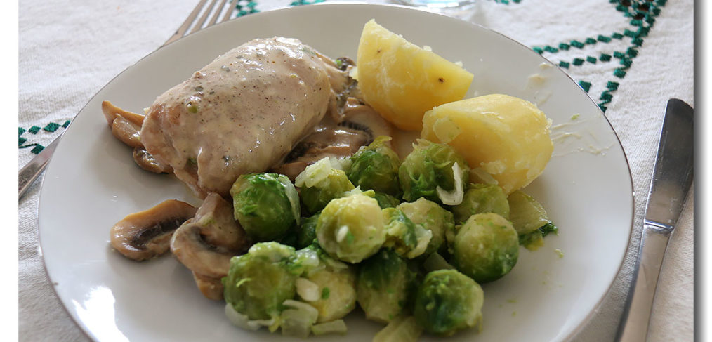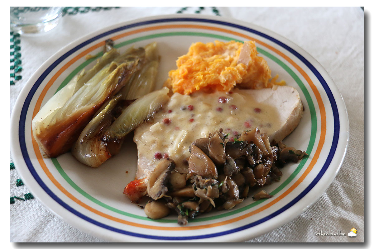 Coupez le rôti de dinde en tranches et répartissez-les sur les assiettes. Servez avec l’écrasé de Butternut, les champignons et les chicons. Garnissez avec la sauce.