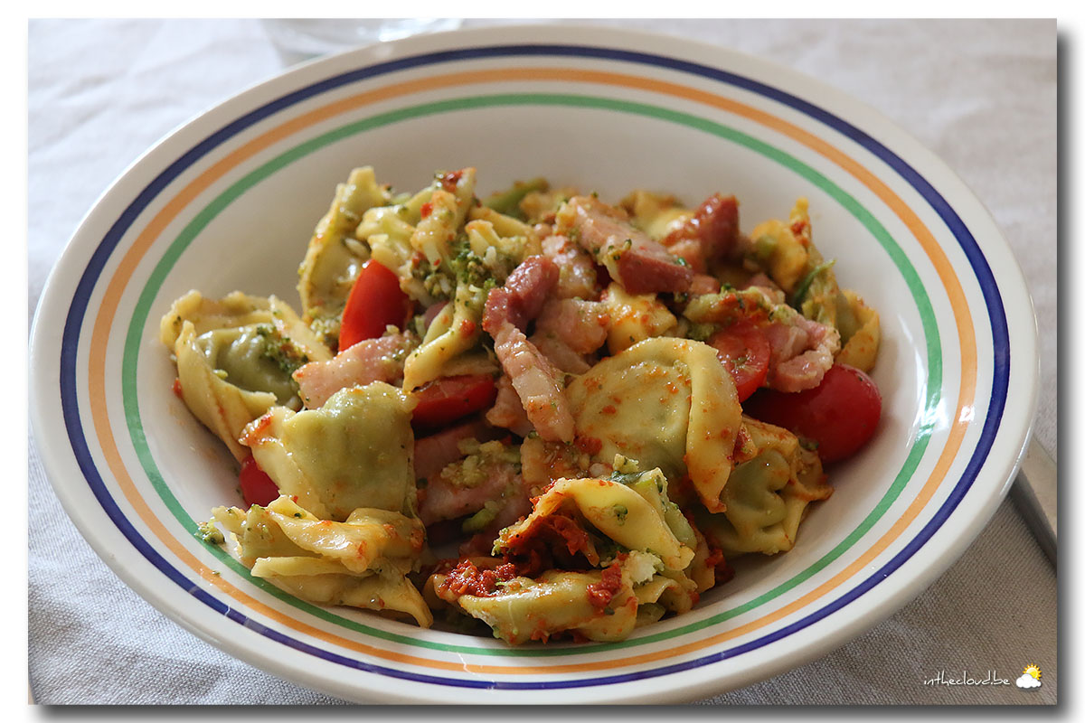 Mélangez les raviolis, les lardons, les brocolis, les tomates et le basilic dans un saladier. Mélangez dans un petit bol l’huile, le vinaigre et le pesto de tomate avant de verser cette sauce sur la salade. Remuez et servez sans attendre.