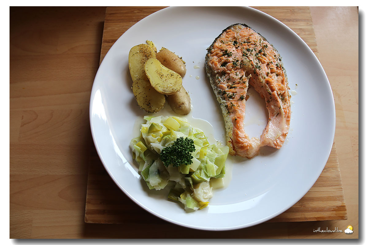 Dresser sur une grande assiette. Mettre un peu d’aneth sur les darnes.