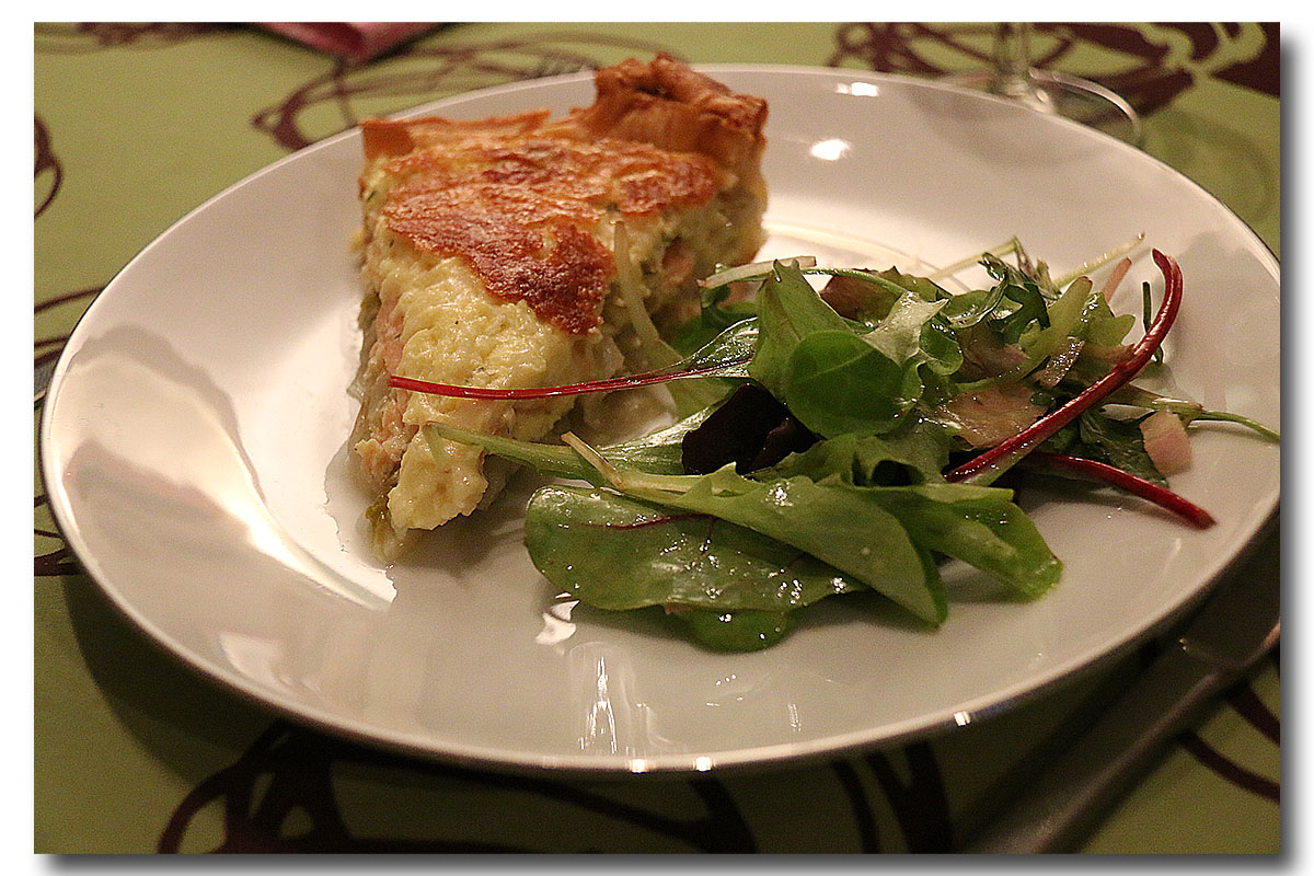 Sortez la pâte du four et ôtez le papier et les perles de cuisson. Répartissez les chicons sur la pâte et les lanières de saumon par-dessus. Versez ensuite le mélange à la crème. Garnissez avec les tranches de mozzarella et glissez 35 min au four.sel et poivre
