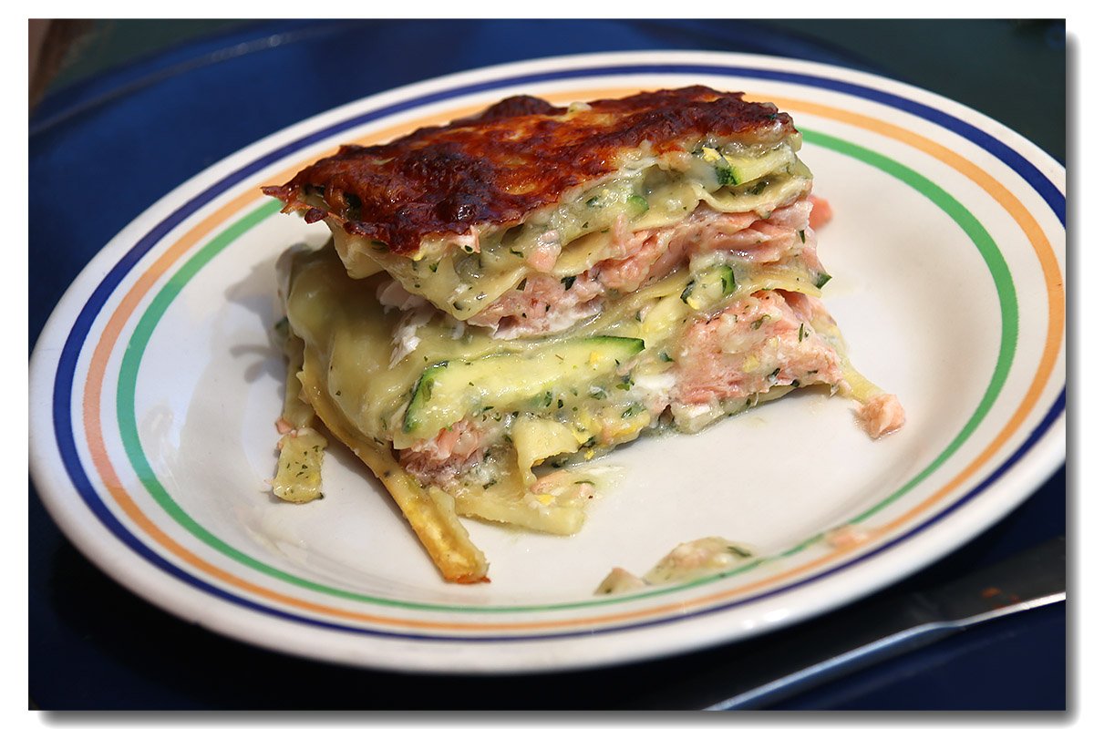 Composez la lasagne, dans un plat profond allant au four : d’abord une fine couche de sauce, puis des feuilles de lasagne (déposez-les les unes à côté des autres, sans trop les faire se chevaucher), à nouveau de la sauce, puis les tranches de saumon (que vous salez et poivrez), à nouveau des feuilles de lasagne, les rondelles de courgettes, et à nouveau des feuilles de lasagne. Terminez par une couche de sauce et parsemez de mozzarella râpée.
