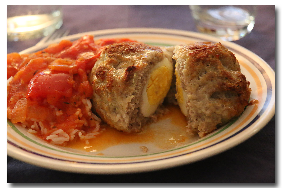 Façonnez 4 boulettes de hachis de taille égale. Formez un trou dans chacune et enfoncez-y un oeuf dur. Refermez les boulettes et roulez-les uniformément entre vos mains. L’oeuf doit être dissimulé et le hachis bien lisse.