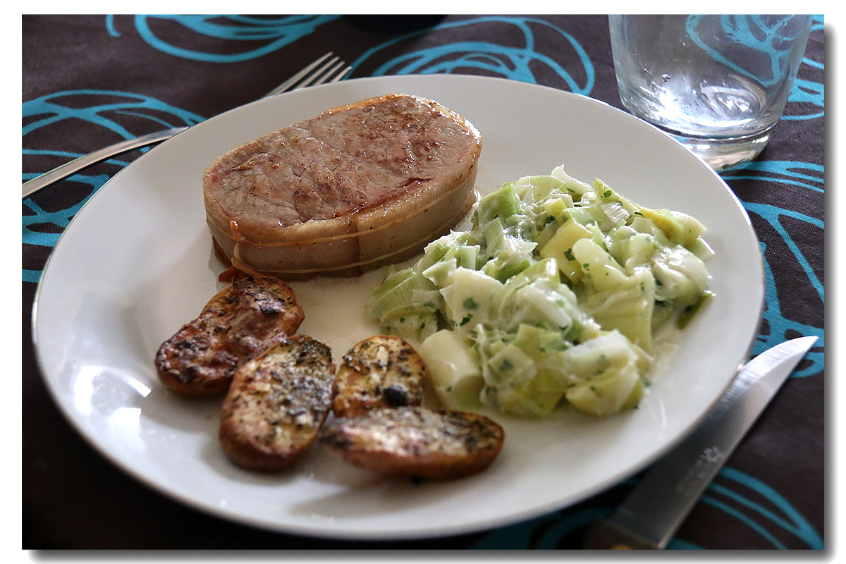 Coupez le gigot en tranches obliques parallèlement à l’os. Servez avec les pommes de terre à l’ail et une petite salade ou des tomates grillées.