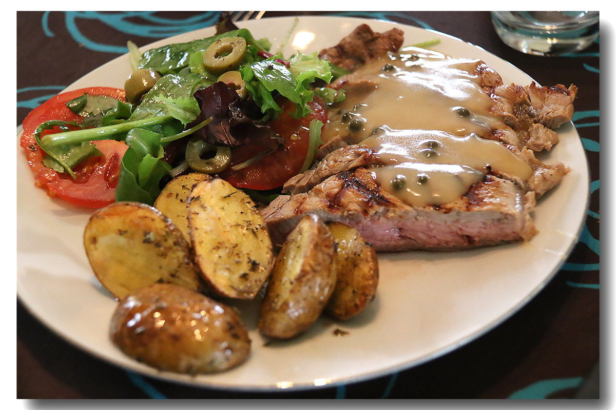 Coupez les steaks en tranches obliques et dressez-les sur les assiettes. Servez avec la sauce au poivre vert, la salade et les pommes de terre grillées.
