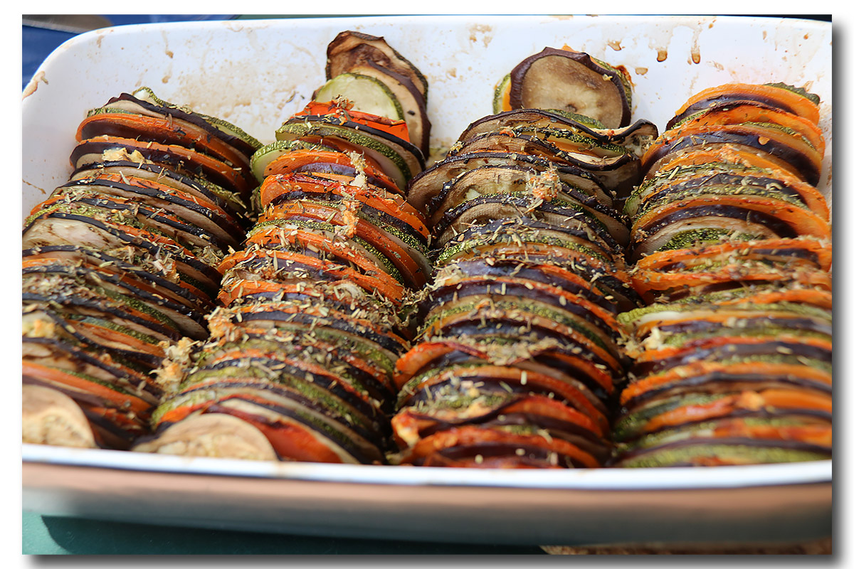 Couper les légumes en rondelles avec une mandoline et disposer-les dans le plat, en rangées serrées, presque verticalement. Saupoudrer-les avec les gousses d’ail pressées, les herbes de Provence, du sel et du poivre.