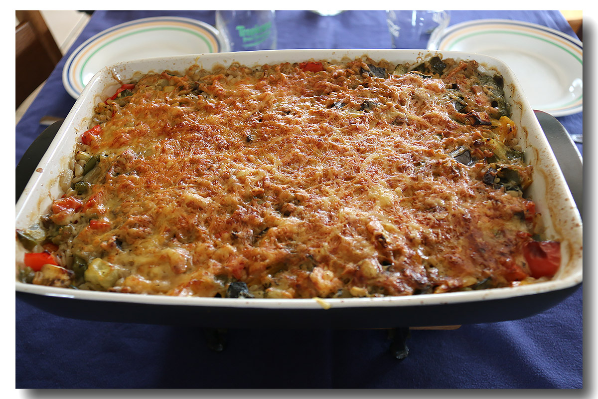 - Couvrez de bouillon de légumes et parsemez d’emmental. Glissez le plat au four préchauffé à 180 °C durant 40 min.
