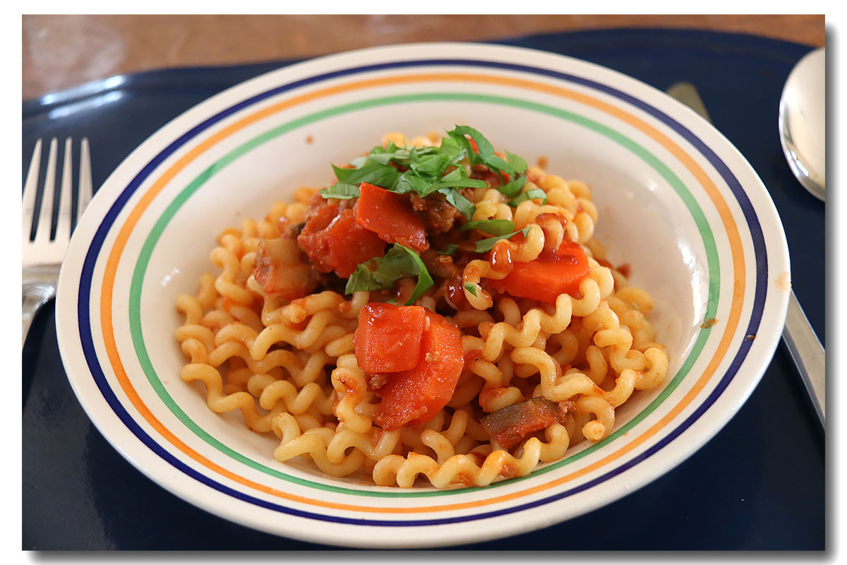Présentez les pâtes aux légumes sur les assiettes et garnissez-les de lanières de viande. Nappez de jus de cuisson.