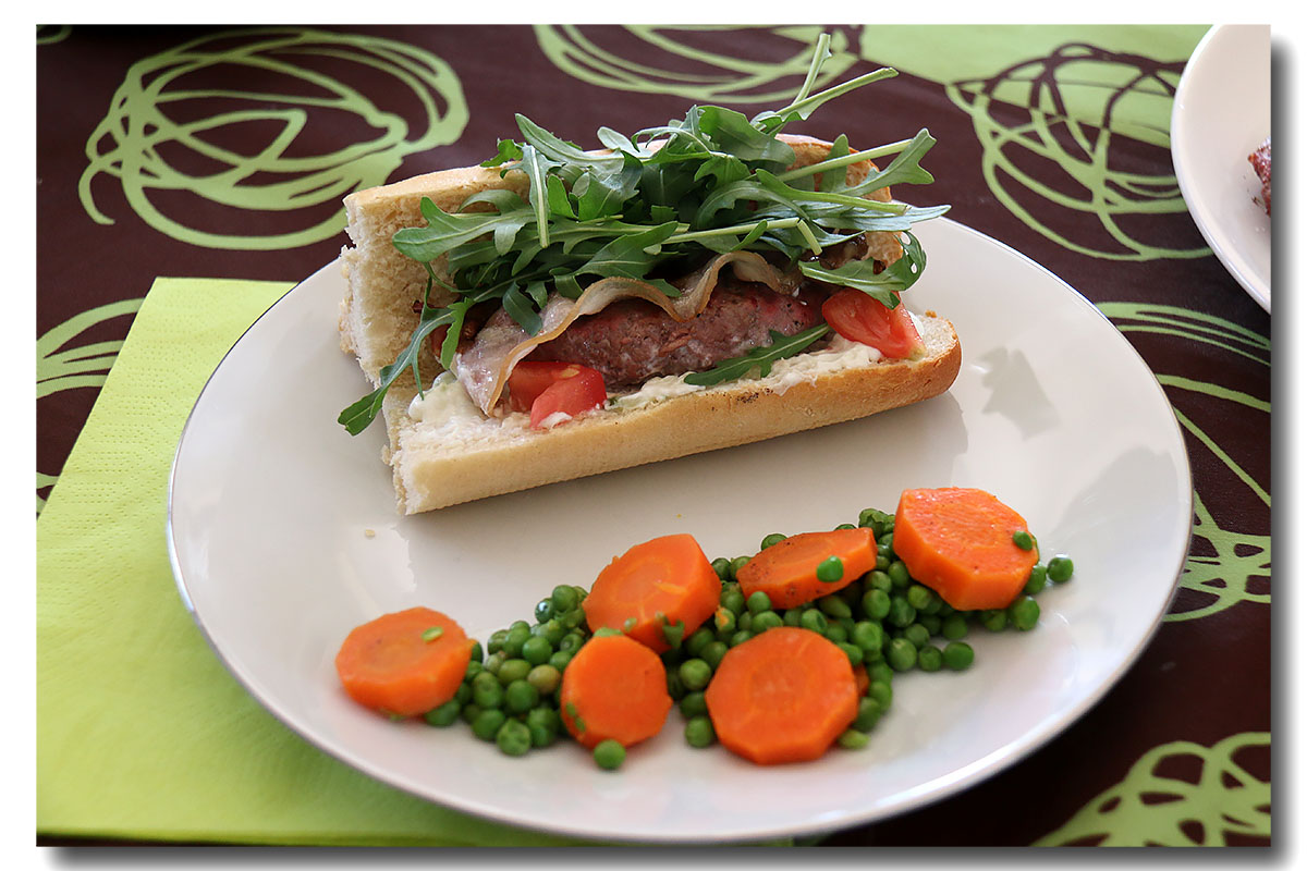 Ouvrez les baguettes d’un seul côté et garnissez chacune d’1 steak haché coupé en 2 et de 2 tranches de lard grillé. Agrémentez de tzatziki, de dés de tomates et de roquette.