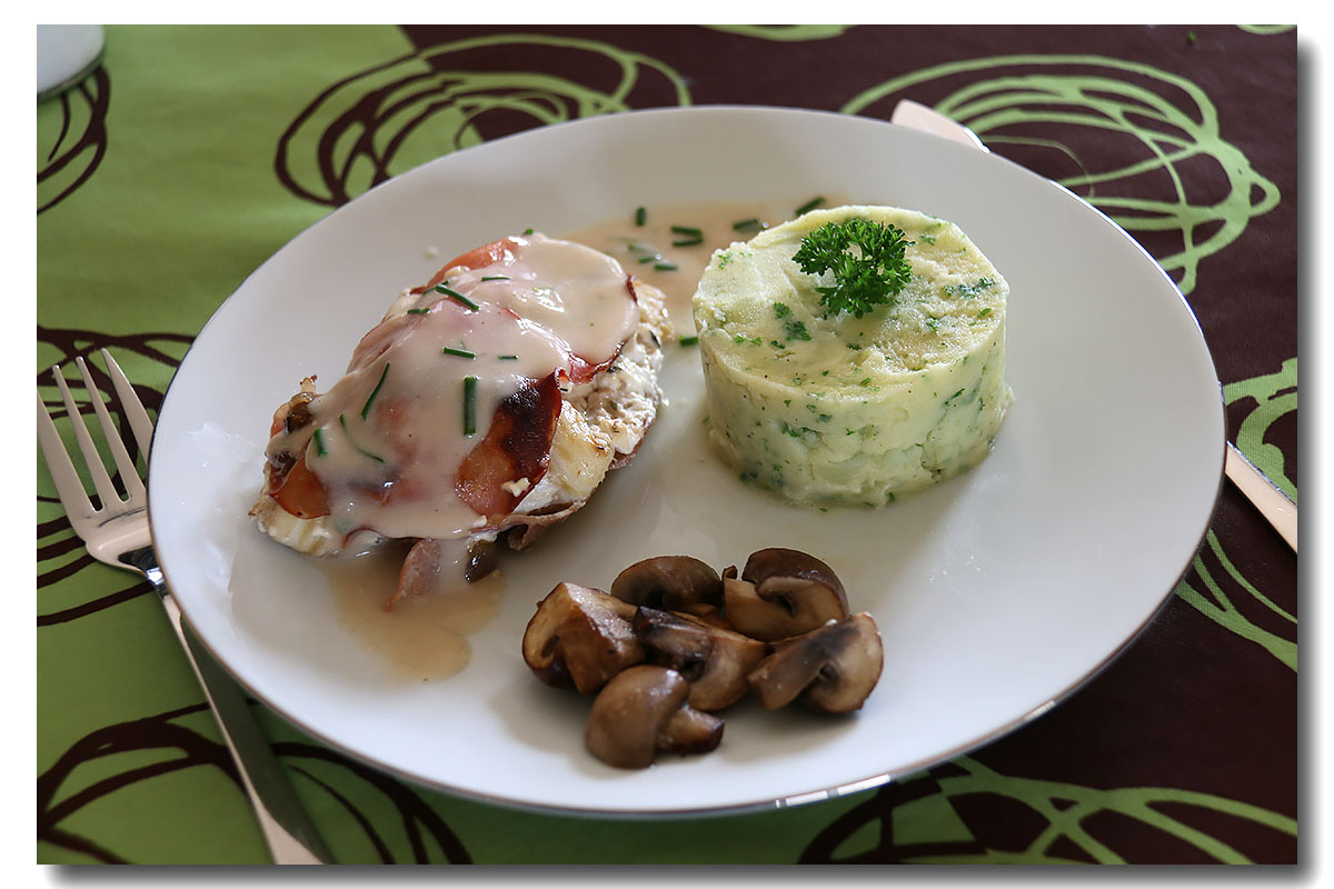 Répartissez les filets de cabillaud sur les assiettes. Entourez le poisson de champignons et de sauce. Servez avec de la purée de pomme de terre.