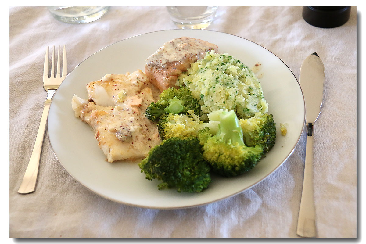 Nappez le poisson de sauce et servez avec le brocoli vapeur et la purée.