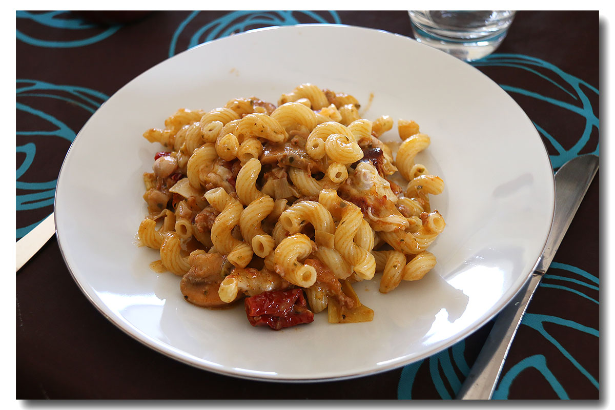 Entre-temps, faites cuire les pâtes dans de l’eau bouillante additionnée du cube de bouillon (voir temps de cuisson sur l’emballage). Égouttez-les et arrosez-les d’huile d’olive.